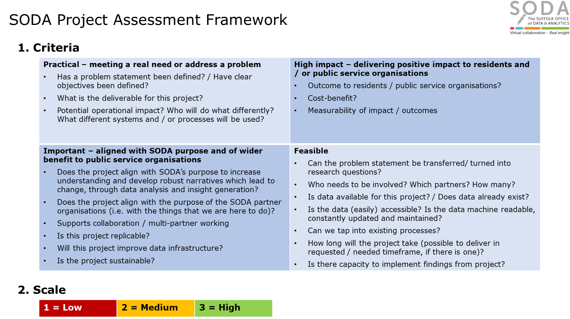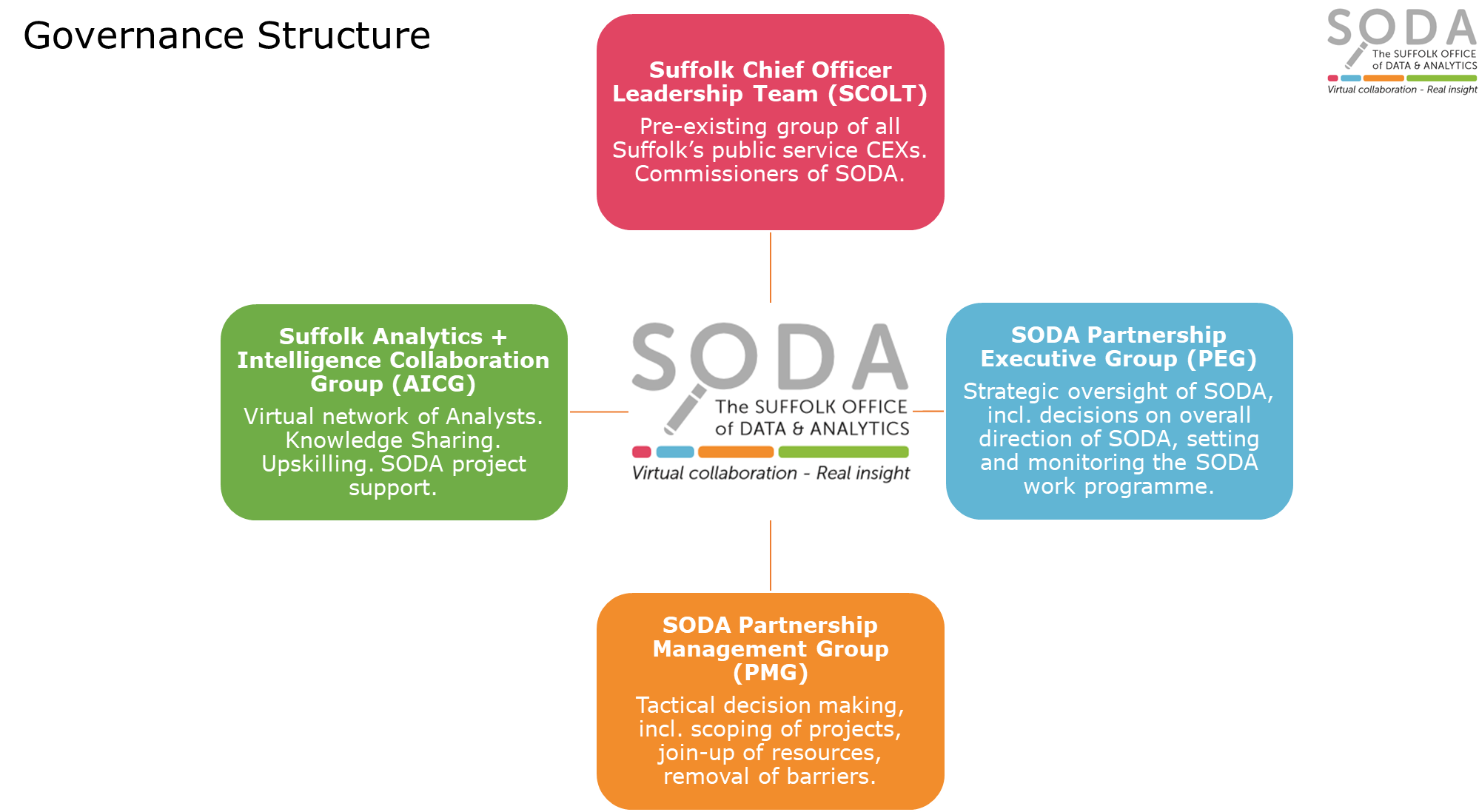 The Suffolk Office of Data & Analytics (SODA) has developed a number of documents, which you may find useful for working on shared data projects. If you have any questions regarding the documentation below, please contact us at soda@suffolk.gov.uk.